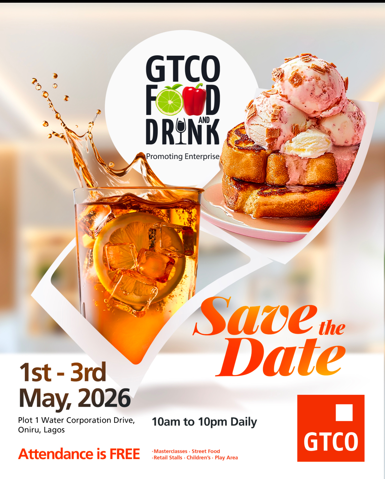 Guaranty Trust Holding Company Plc (GTCO Plc) is pleased to announce the 9th edition of the GTCO Food and Drink Festival, scheduled to hold from Friday, May 1st to Sunday, May 3rd, 2026, at GTCentre, Plot 1 Water Corporation Drive, Oniru, Victoria Island, Lagos.Geographic Reference
